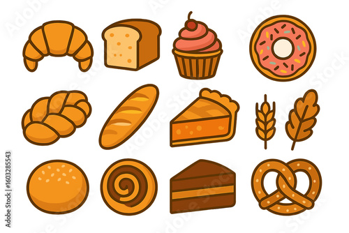 Bakery products colorful icons vector illustration set on transparent background. Pastry, bread, cake, donut, croissant, pie, pretzel, cupcake design element collection.