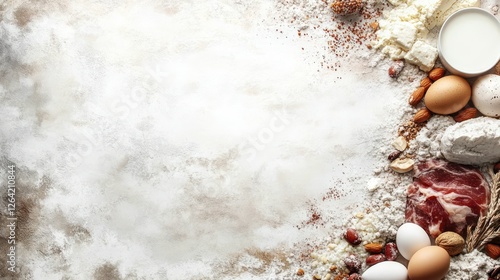 Baking Ingredients: A delightful and inviting composition of essential baking ingredients arranged artfully on a textured surface, creating a visual feast for culinary enthusiasts.