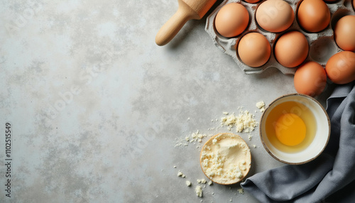 Baking ingredients eggs flour and rolling pin on a gray surface.