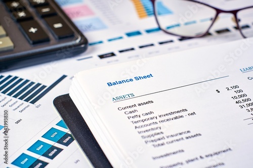 balance sheet, calculator and glasses on the background of financial documents, close-up