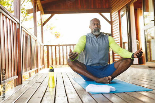 Bald african american senior man meditating on mat in balcony at log cabin