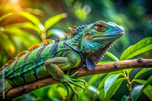 Banded Fiji Iguana Relaxing on a Branch Surrounded by Lush Greenery in its Natural Habitat