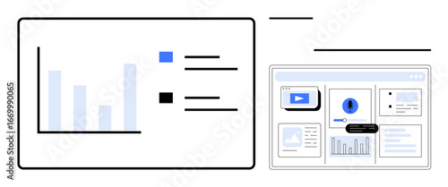 Bar chart beside a dashboard with multimedia elements and graphs. Ideal for data analytics, presentations, education, productivity, digital tools, business planning, digital workflow. Simple flat