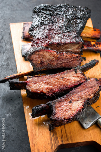 Barbecue burnt chuck beef ribs marinated with hot chili sauce as closeup on an old rustic wooden board