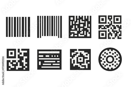 Barcode Icon Set. Solid, filled icon set of barcode types: UPC barcode, EAN barcode, Code128, QR code, Data Matrix, PDF417, Aztec code, MaxiCode. [Line icons