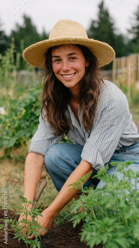 Barefoot Gardener Planting Sunflower Seedlings in Wild Backyard Garden