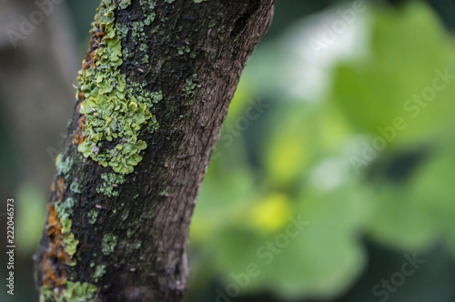 Bark of an old tree with a lichen. Focusing on the details, the emerald background is blurred. Green, yellow, orange. Nature concept for design