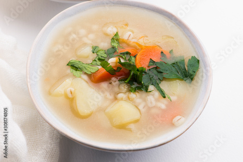 Barley soup, pearl barley in white bowl