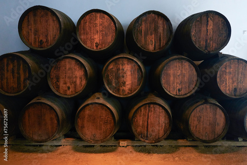 Barrels for whiskey or wine stacked in the cellar