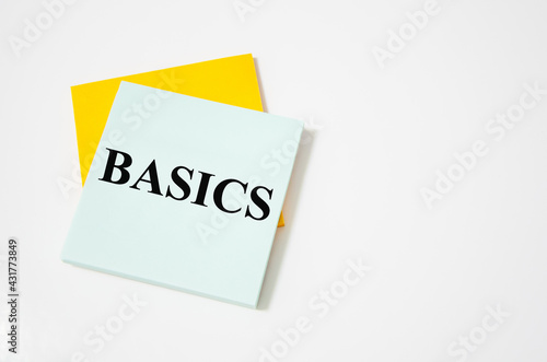 BASIC text written on a white notepad with colored pencils and a yellow background. word