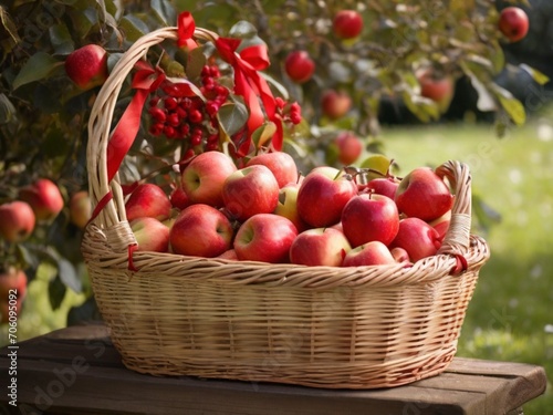BASKET OF APPLES IN AN ORCHARD IN DAYLIGHT