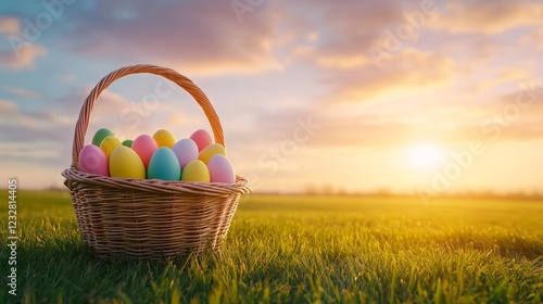 Basket of Colorful Easter Eggs in a Sunny Meadow - A vibrant basket filled with pastel Easter eggs in a meadow at sunset symbolizes joy, spring, renewal, celebration, and tradition.