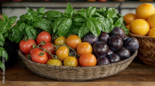 Basket of colorful ripe tomatoes, dark plums, and fresh basil