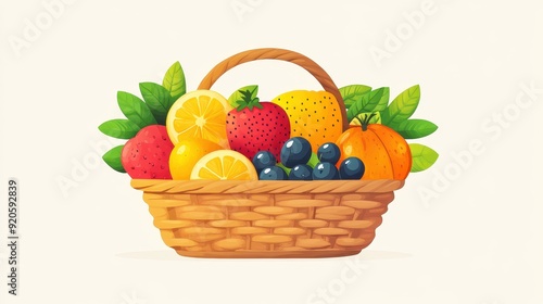 Basket of Fresh Colorful Fruits Including Lemon, Strawberry, Orange, Blueberry, Apple, and Leaves