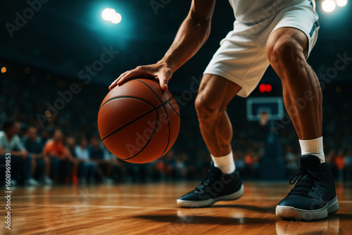 Basketball player dribbling on court game