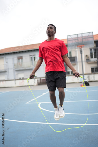 Basketball player jumping rope in an outdoors court