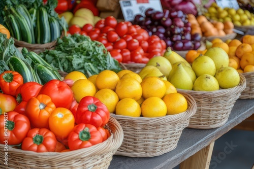 Baskets of fresh organic fruits and vegetables