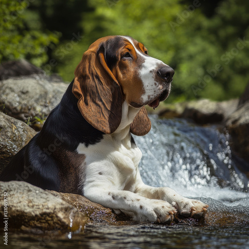 Basset Hound sitting beside a bubbling stream, long ears draped down, peaceful and serene, UHD 8K