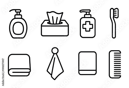 Bathroom essentials icon set – outline style for hygiene, personal care, and cleaning: soap dispenser, tissue box, hand sanitizer, toothbrush, towel, comb