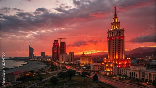 Batumi Georgia Sunset: Red Sky Over City Buildings - Stock Photo