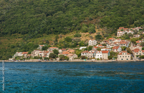 Bay of Kotor, view from the sea to the old town of Herceg Novi in Montenegro, Europe, Adriatic Sea and mountains