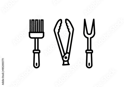 BBQ and Cooking Utensil Line Icons Set – Grill Brush, Kitchen Tongs, and Meat Fork