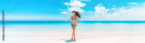 Beach Asian woman with fit summer bikini body happy running enjoying Caribbean vacation laughing of joy in tropical destination banner panorama. Blue swimwear model enjoying summer holidays.