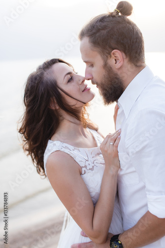Beach honeymoon couple kissing and hugging on white sand beach. Newlyweds happy in love relaxing on summer holidays. Travel vacation concept.