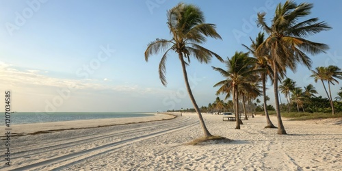Beach scene with palm trees swaying gently in the breeze, peaceful, relaxation, calm