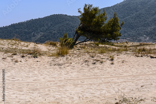 Beach with big sand dunes and small marram grass with mountain and clean sky