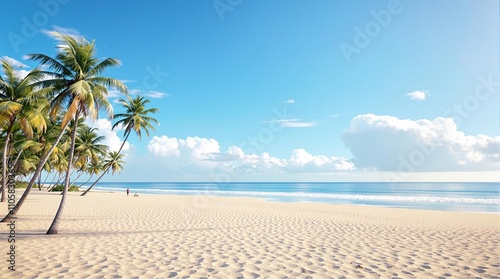Beach with palm trees swaying gently in the breeze, beach scenery, serene atmosphere