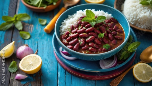 Beans curry served with rice in a bowl, surrounded by fresh herbs and lemon slices. Traditional Indian dish, spicy and flavorful.