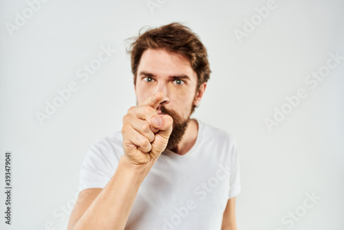 Bearded man gesturing with hands cropped view white t-shirt studio emotion light background