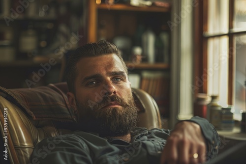 Bearded Man Sitting by Window in Detailed Barber Scene