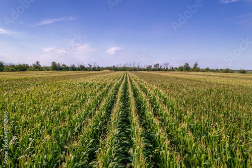 Beautiful aerial view of endless green agricultural field with crops on sunny and cloudy summer day. Flying over corn seedling field, harvest crops in the rural area countryside farm field.