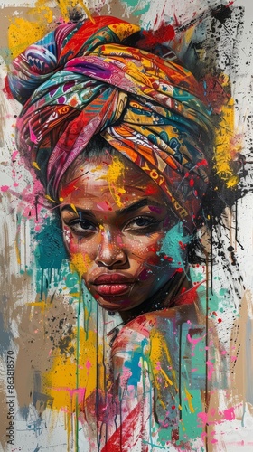 Beautiful african american woman wearing colorful headscarf with abstract paint