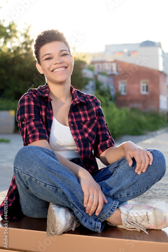 beautiful and happy African American woman with a short haircut in the summer on the street