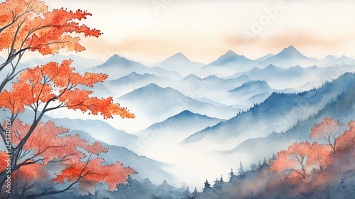 Beautiful autumn landscape with misty mountains and vibrant orange foliage at dawn