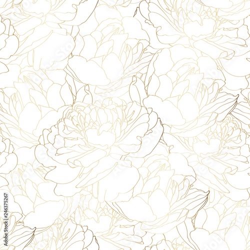 Beautiful backdrop with blooming tulips flowers, hand drawn with golden contour lines on white background. Gorgeous floral decoration. Botanical illustration.