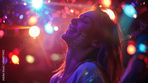beautiful black woman with curly hair or afro dancing in a neon disco
