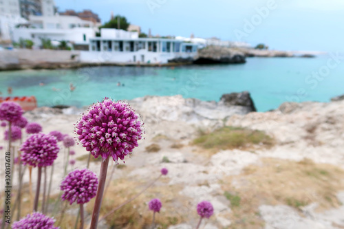 Beautiful blooming purple wild garlic flower on the Monopoli beach, Italy, Apulia region, Adriatic Sea