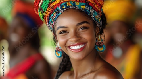 Beautiful brazilian woman smiling and wearing traditional colorful headscarf