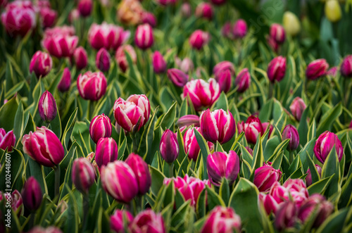 Beautiful bright colorful purple pink white blooming tulips on a large flowerbed in the city garden or flower farm field in springtime. Spring easter flower background.
