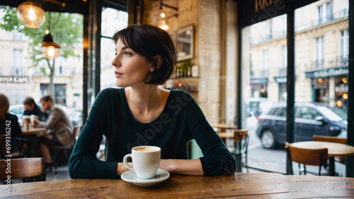 Beautiful brunette woman sitting alone in a café and drinking coffee