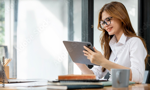 Beautiful businesswoman working on digital tablet and laptop computer at office.