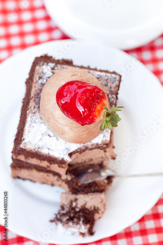 beautiful cake with strawberry and tea on plaid fabric