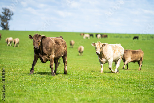 beautiful cattle in Australia eating grass, grazing on pasture. Herd of cows free range beef being regenerative raised on an agricultural farm. Sustainable farming