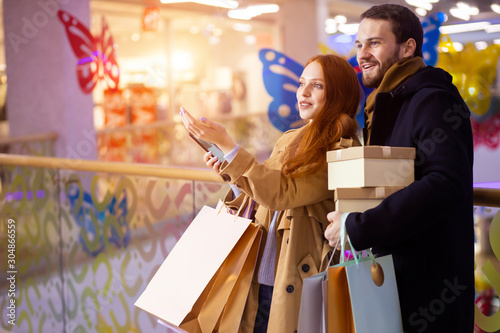beautiful caucasian couple buy gifts, new clothes, bearded man hold gifts in hands, caucasian female with red hair holding paper bags