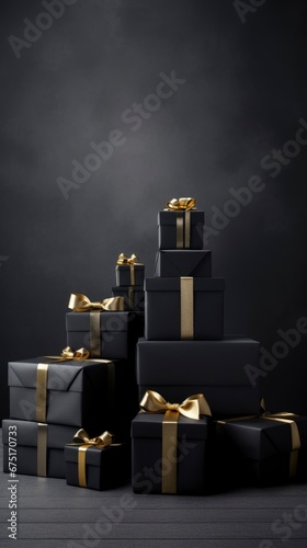 Beautiful Christmas black gift boxes on dark festive background banner