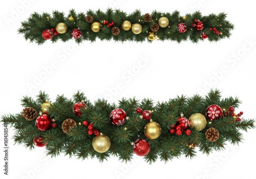 Beautiful Christmas garland with festive ornaments and winter berries on a white background.